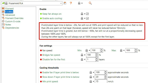 In PrusaSlicer, the cooling settings are quite simple and easy to access. It lets you adjust the cooling settings for each filament type. There’s a nifty option called “Keep fan always on” which will make sure the print fan maintains at least a minimum speed throughout the print.