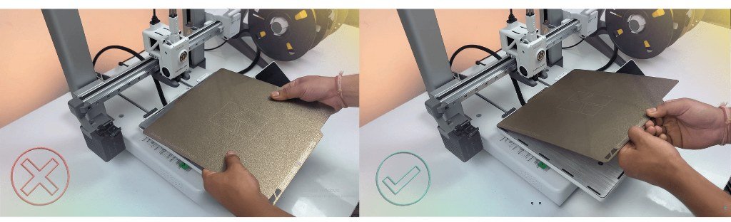 When placing or adjusting the build plate, avoid touching the print surface directly — always hold it from the edges.
